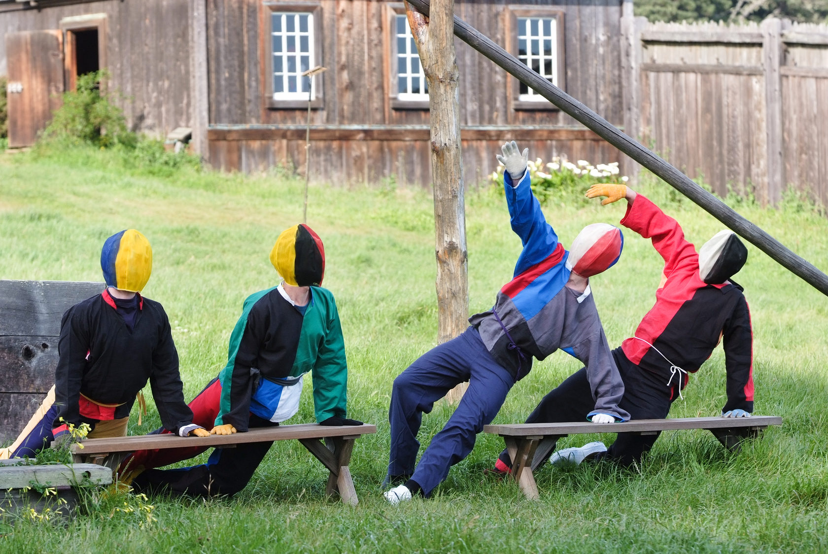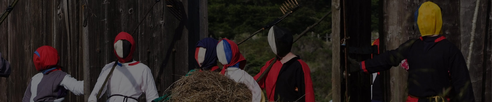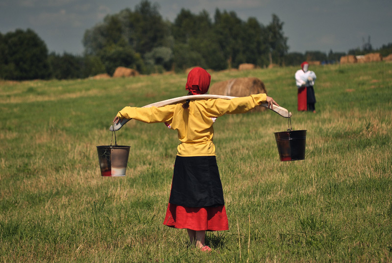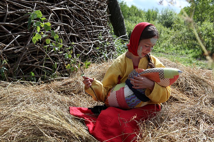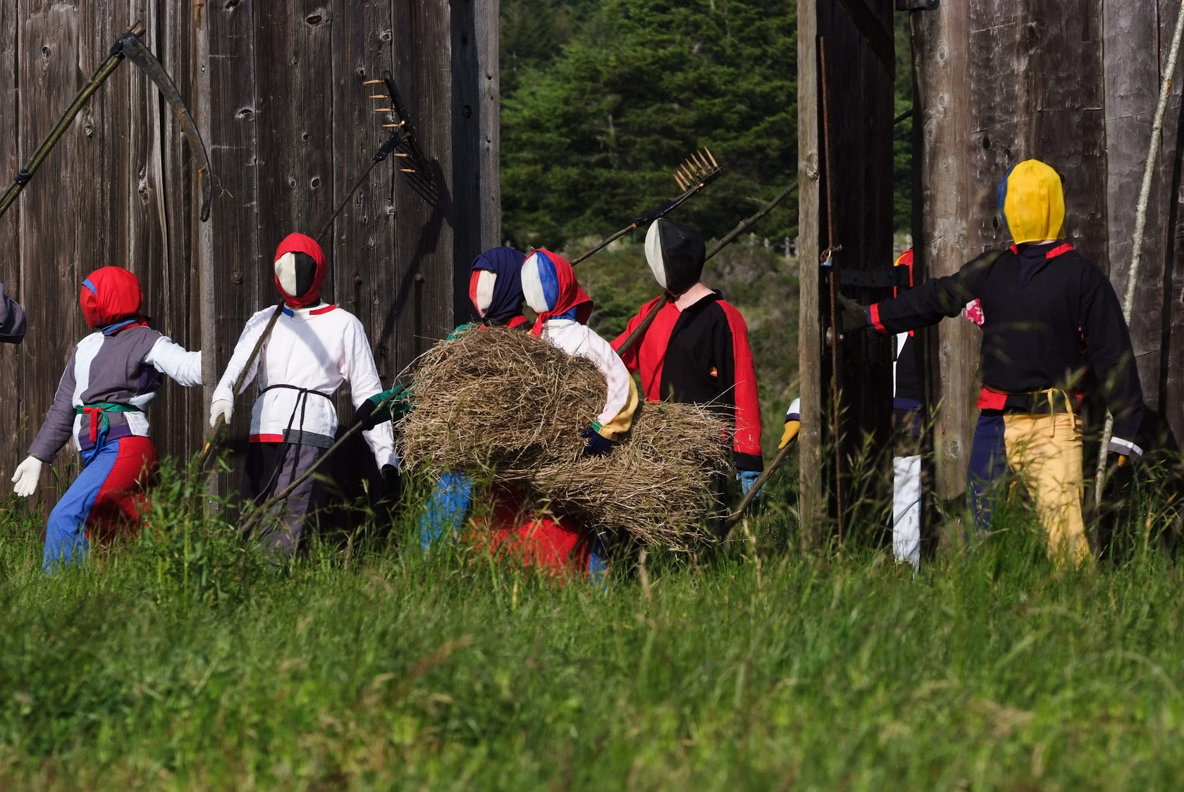 Вдоль дороги, по которой приезжали на фестиваль гости и участники, супрематические крестьяне, навеянные картинами Казимира Малевича, со стертыми лицами, в красных трапециевидных юбках, синих широких штанах и желтых прямоугольных рубахах застывали в привычных для крестьян мизансценах - с косами, ведрами, младенцами, скутанными из одеял.